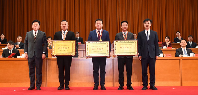 總經(jīng)理丁志鴻(右二)上臺領(lǐng)取2024年度溧陽市特別貢獻獎