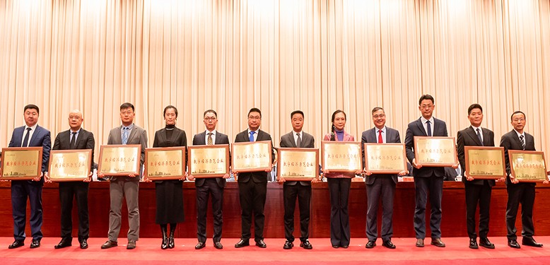 總經(jīng)理丁志鴻(右六)上臺領(lǐng)取2024年度常州市數(shù)字經(jīng)濟示范企業(yè)